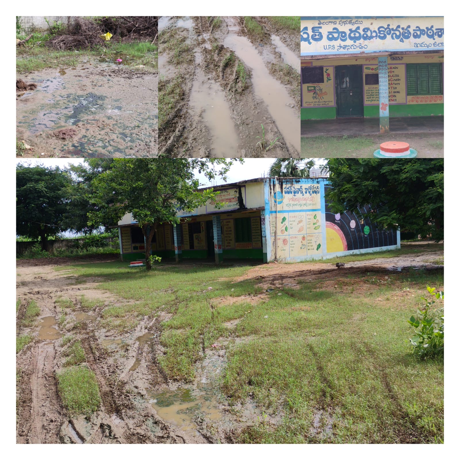 సాతాని గూడెంపంచాయతీ పరిధిలోని సాతాన్ని గూడెం “యుపిఎస్” ప్రాథమిక పాఠశాలలో వర్షాలకు మురుగు నీరు చేరింది. రోజులు గడుస్తున్న కొద్దీ నిలిచిన నీటిలో క్రిమికీటకాలు పెరిగి దుర్గంధం వెదజల్లుతోంది. దీంతో పాఠశాలకు ఆ నీళ్లలోనే నడిచి వెళుతూ చిన్నారులు ఇబ్బందులు పడుతున్నారు. చుట్టుపక్కల ఇళ్లు ఎత్తులో ఉండటంతో పడిన వర్షపు నీరు పల్లంలో ఉన్న పాఠశాల ఆవరణంలోనే నిలిచిపోతున్నాయి.